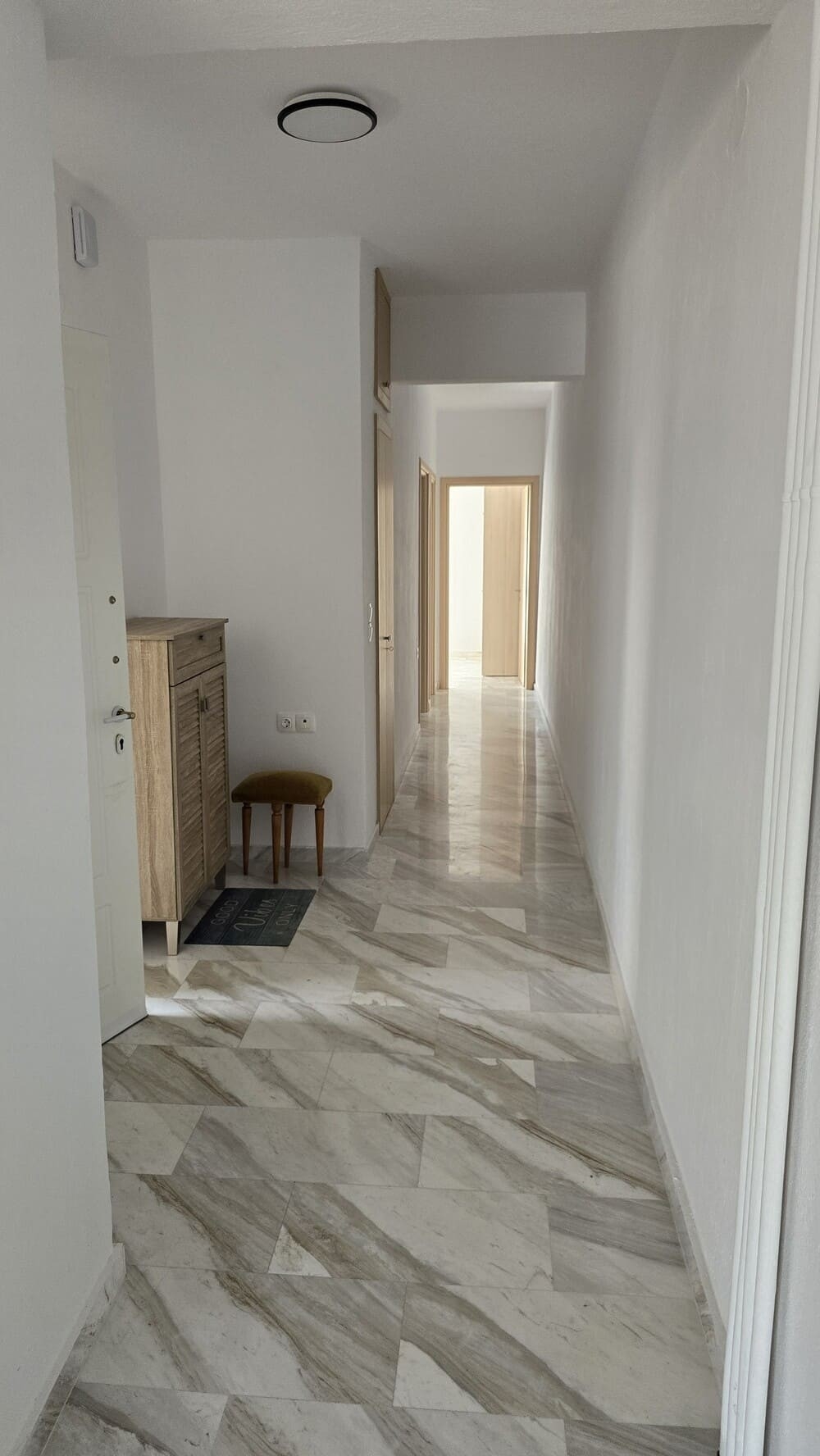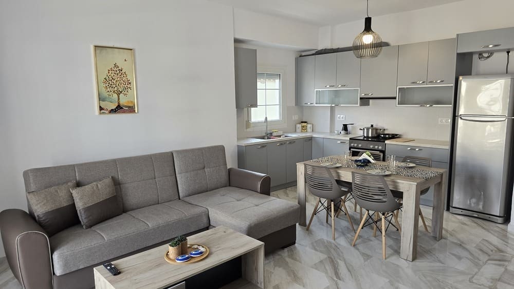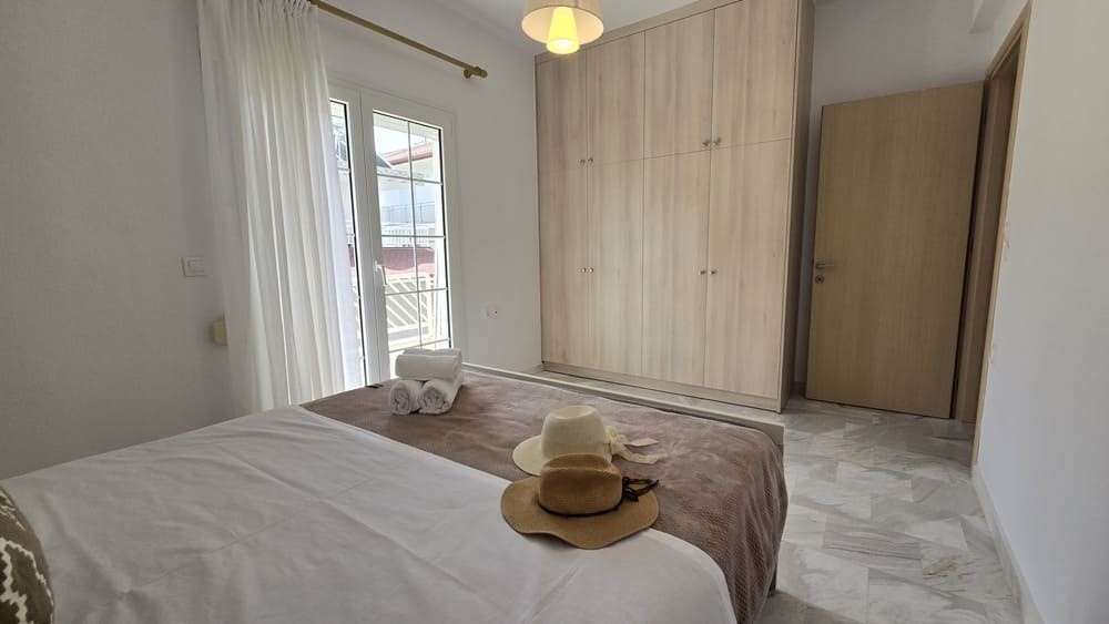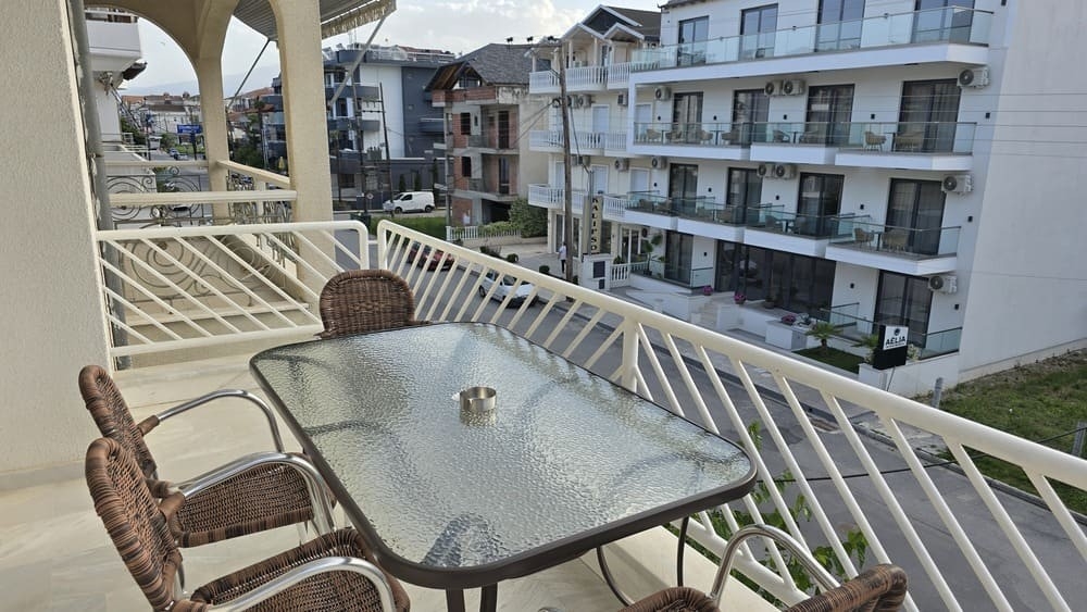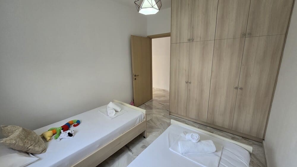 It features two spacious bedrooms – one with a double bed and one with two single beds – each equipped with a large wardrobe for convenient clothing storage. The living room includes a sofa that easily converts into a bed. The fully equipped kitchen allows for home-like meal preparation, while the presence of two large balconies offers unique relaxation moments. Additionally, there are two air conditioning units in the living room and the master bedroom, providing coolness and comfort. There is also free Wi-Fi access and a smart TV in the living room for unlimited entertainment. The apartment is located just 100 meters from the beach, making it ideal for those who desire easy access to the sea and relaxing moments in the sun. Furthermore, there is a large supermarket just 100 meters away, making daily shopping convenient for guests.